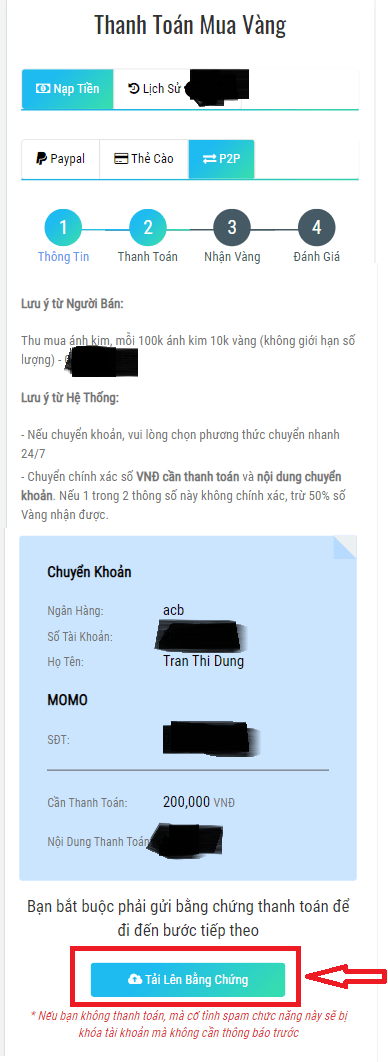 Sau khi tải lên bằng chứng, Hệ Thống đã liên hệ đến Người Bán. Bạn vui lòng đợi Người Bán xác nhận và Chuyển Vàng.