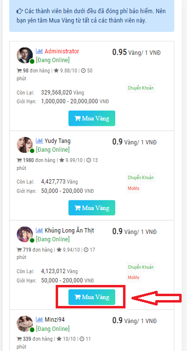 Sau khi nhấn vào Mua Vàng của thành viên này, sẽ ra giao diện như sau