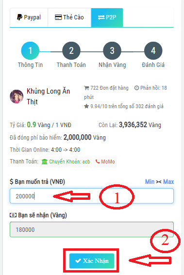 - Tỷ giá: Nếu tỷ giá là 0.9 Vàng/ 1 VNĐ thì cứ mỗi 1 triệu VNĐ bạn nhận được 900,000 Vàng. Tỷ giá này càng cao thì bạn càng nhận được nhiều Vàng